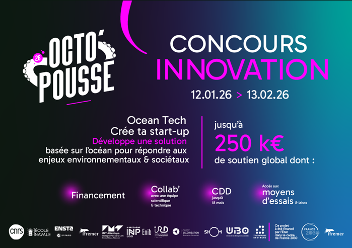 Vous souhaitez transformer votre projet en start-up Ocean Tech à fort impact pour la société et l’environnement ? Octo’pousse accompagne des porteurs de projet avant ou juste après la création de leur entreprise, en lien avec les sciences et technologies marines. Domaines clés d’innovation : Ce que le concours propose aux lauréats : Qui peut candidater ? […]
