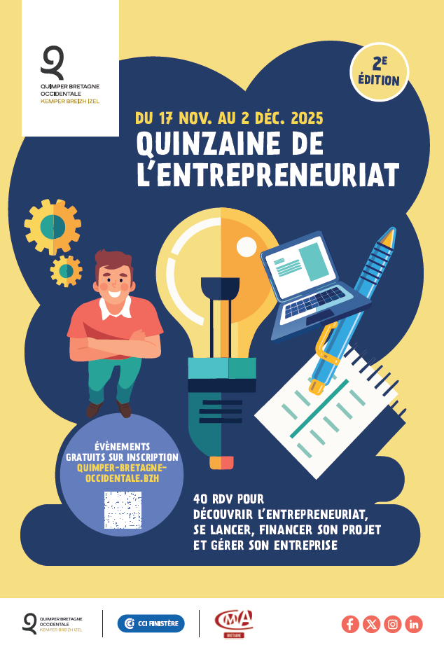 Du 17 novembre au 2 décembre, Quimper Bretagne Occidentale organise la 2e édition de la quinzaine de l’entrepreneuriat, en partenariat avec la CCI Finistère et la Chambre des métiers et de l’artisanat de Bretagne